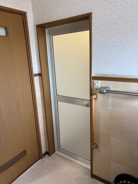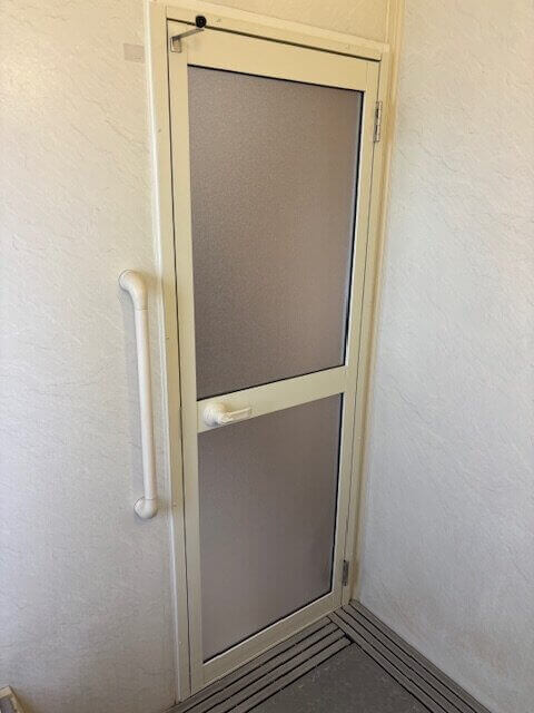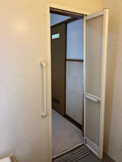 浴室折れ戸が壊れていた為、折れ戸から開き戸(ドア)へ入替ました。