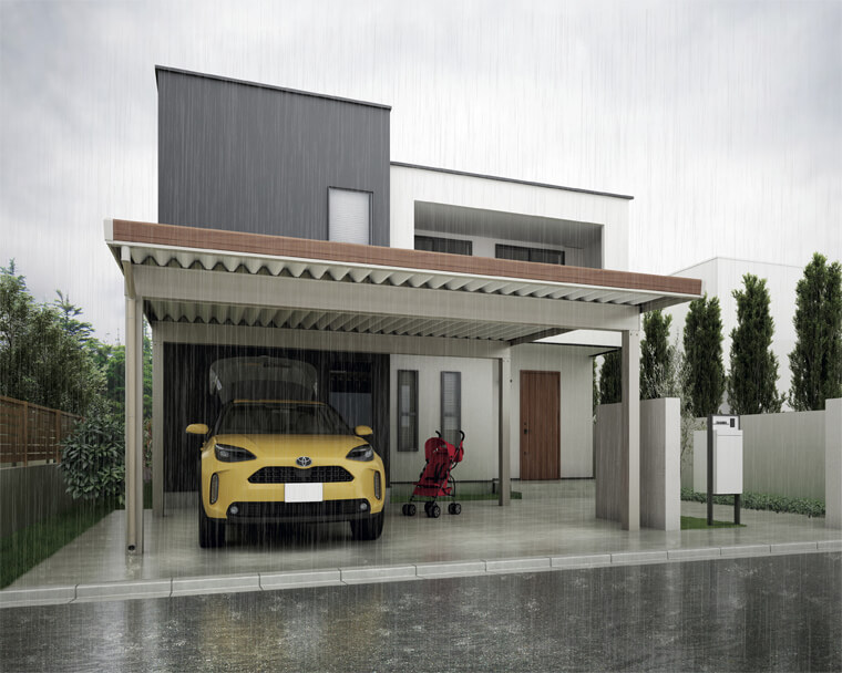 カーポーSWは「基準風速V0=46m/s」という業界最高水準の強度を標準で設定。風に強いカーポートです!!! 折板カーポートならではの直線的で骨太なデザインが、ファサード空間を立体的に演出。梁や屋根の延長、連結も可能なため、カースペースを十二分に活かすことができ、使い勝手や意匠性もグッと向上できます。さらに、さまざまな変形敷地に対応できるよう、3つの変形バリエーションをオプションでご用意しています。
