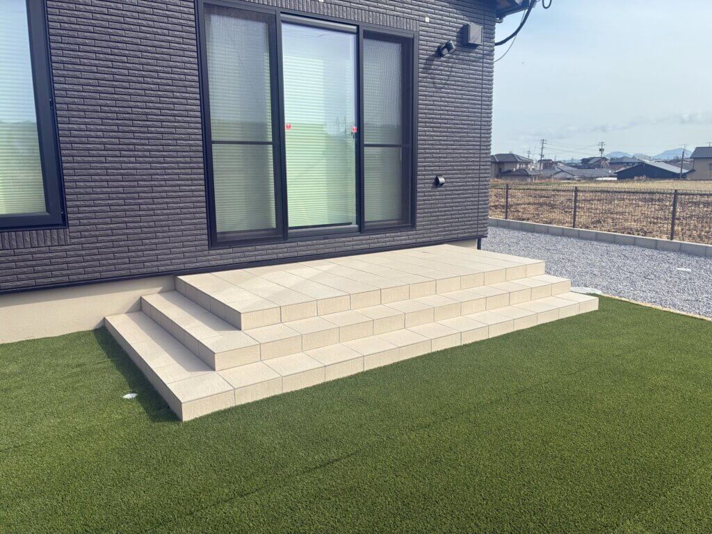 リビング前はタイルデッキ及び人工芝で子供が遊べるスペースを施工。
