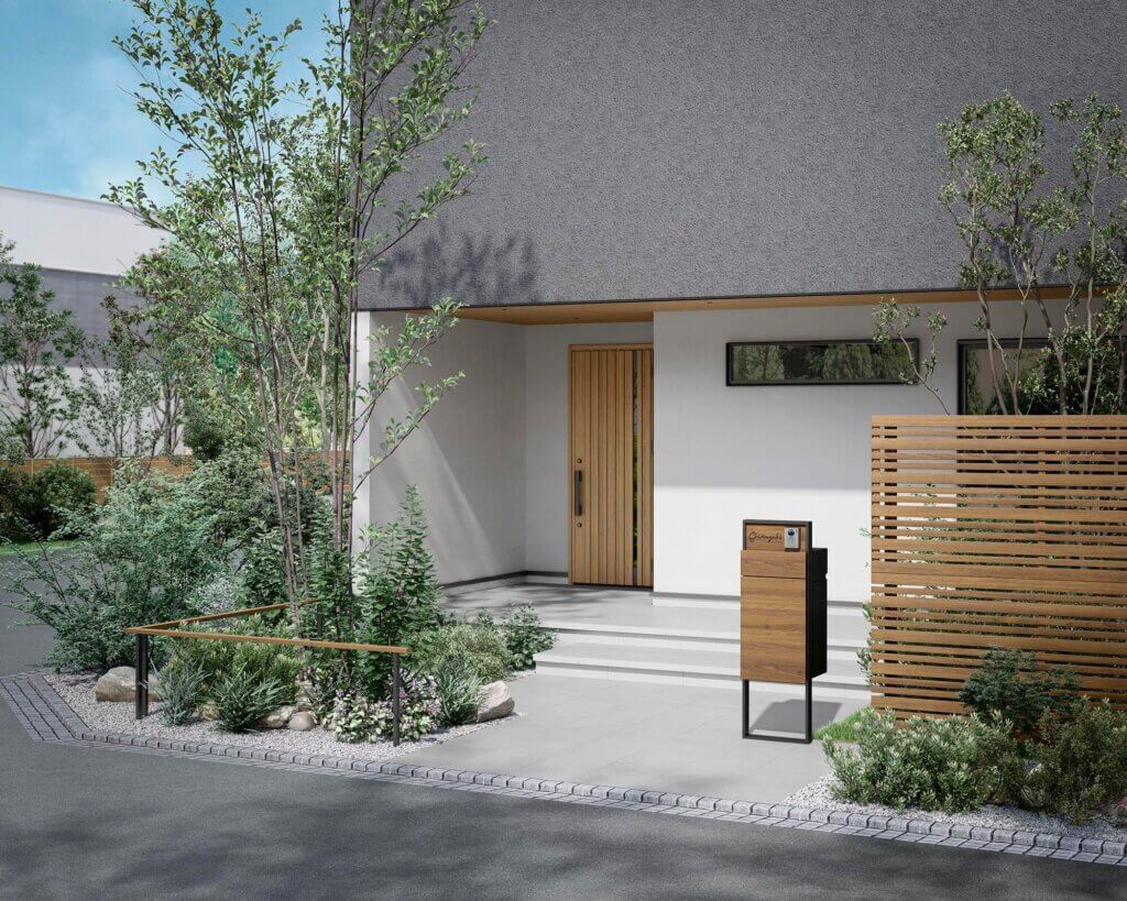 スリムなフレームで、すっきりした印象に。玄関ポーチや玄関アプローチになじむ機能門柱です。基本構成は、フレーム・センターブロック・ボックスセットの3つです。エレメントをはめ込むだけで組み立てることができる、省施工設計です。ボックスは120サイズ(箱)まで受け取り可能な大容量サイズです。